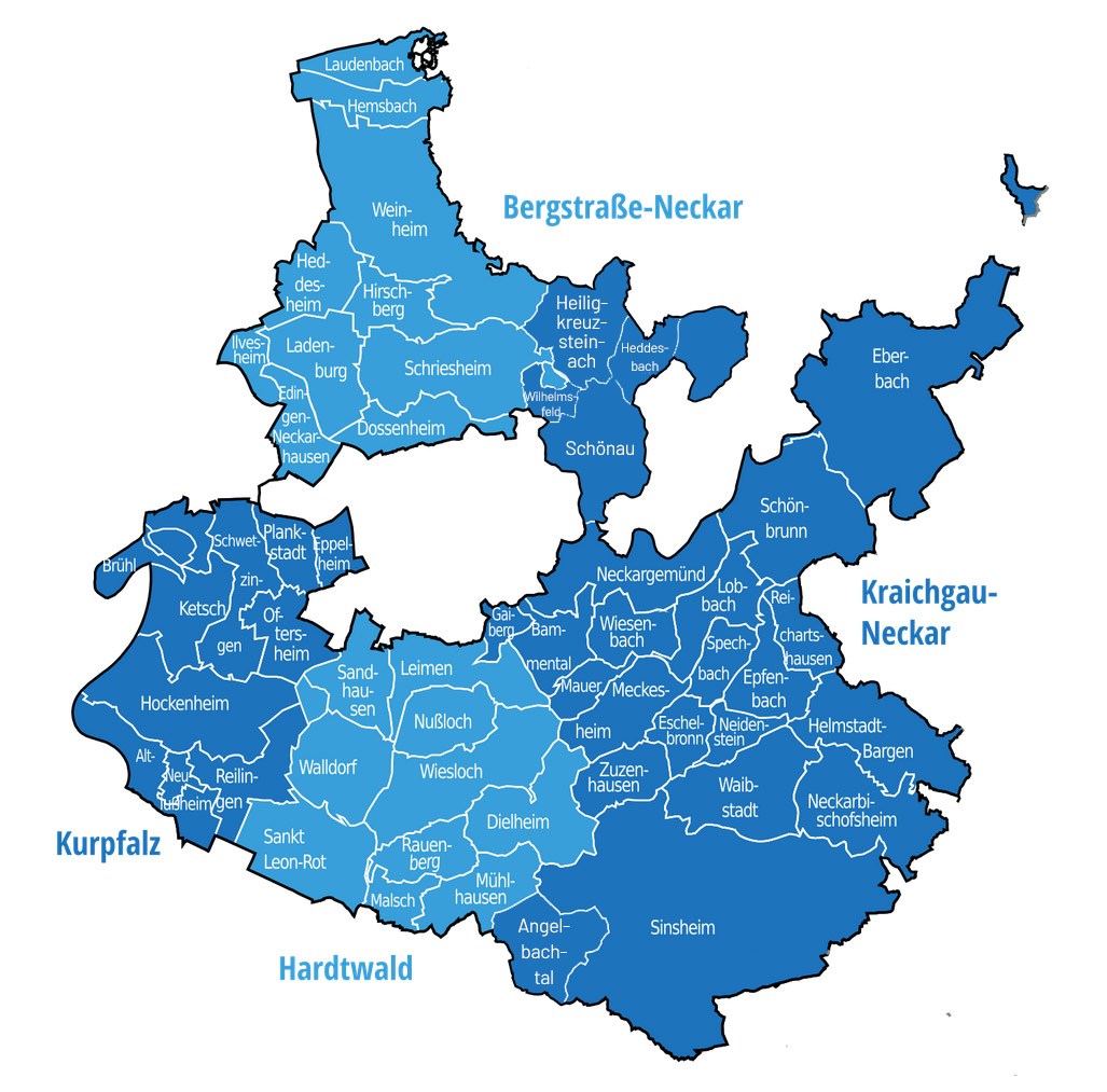 Die AfD Rhein-Neckar ist in vier Gemeindeverbände untergliedert. Die Gemeindeverbände Bergstraße-Neckar, Kraichgau-Neckar, Hardtwald und Kurpfalz entsprechen in ihrer Fläche den vier Landtagswahlkreisen im Rhein-Neckar-Kreis. Diese Einteilung können Sie an der Karte farblich ablesen und gleichzeitig prüfen, ob ihr Wohnsitz im Rhein-Neckar-Kreis liegt und wenn ja, in welchem Gemeindeverband.