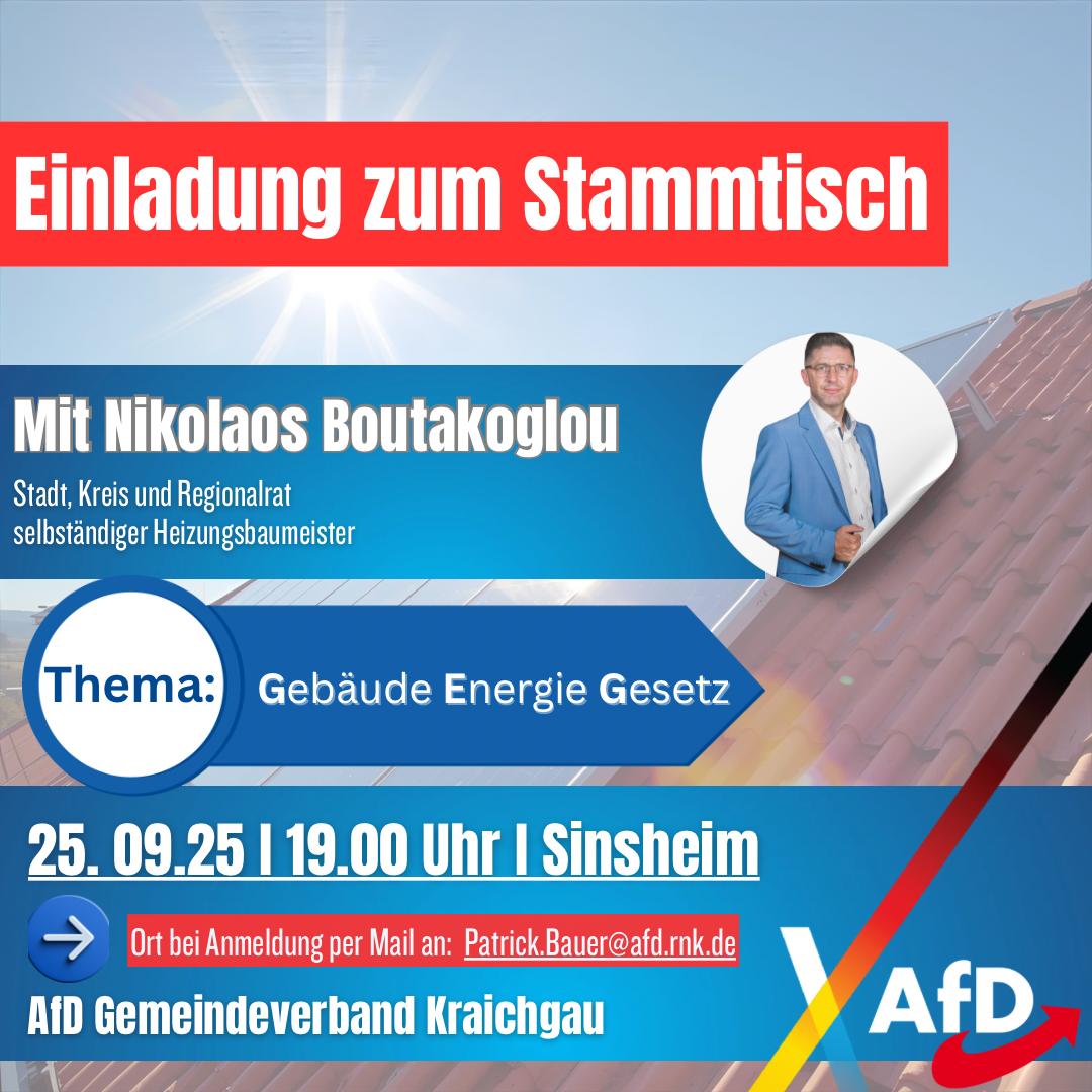 Der AfD Gemeindeverband Kraichgau Neckar lädt ein zum Stammtisch mit Nikolaous Boutakoglou Information und Diskussion zum GebäudeEnergieGesetz (GEG) am 25.09.2025 um 19:00 Uhr in Sinsheim ein. Unser Gastredner, Herr Boutakoglou ist stellvertretender Kreisvorsitzender der AfD in Ludwigsburg und selbständiger Heizungsbaumeister in Vaihingen Neckarelz, wo er auch Ortsverbandsvorsitzender der AfD ist. Er wird über das GebäudeEnergieGesetz (GEG), genannt „Heizungsgesetz“, das noch die Ampel-Regierung beschlossen hat, berichten und gibt Auskunft über seine Anwendung und Weiterführung unter der neuen Regierung. Wir freuen uns auf die Diskussion mit allen, die von dem „Heizungsgesetz“ betro�en sind oder es in Zukunft sein werden. Für die Diskussion darüber mit Herrn Boutakoglou wird ausreichend Zeit sein wird. Eure Anmeldung, bei der auch der Ort bekanntgegeben wird, erbitten wir per E-Mail an Patrick Bauer unter patrick.bauer@afd-rnk.de . Wir freuen uns auf Euer Kommen Der AfD Gemeindeverband Kraichg