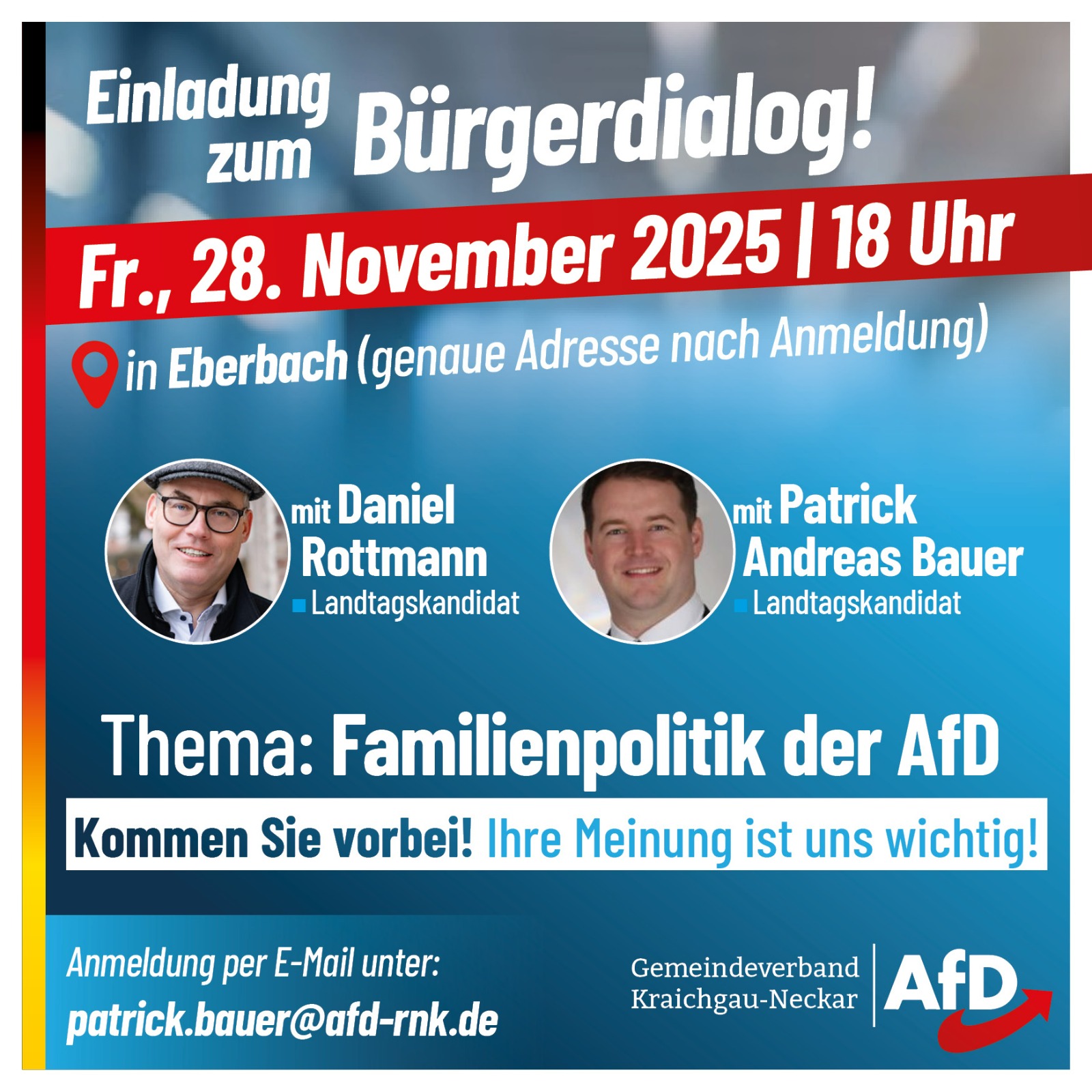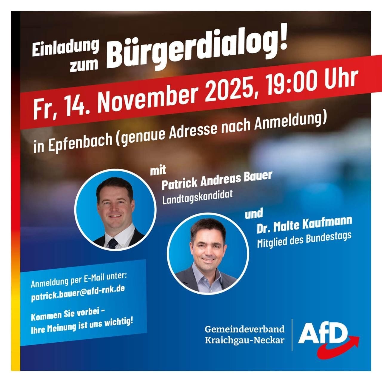 Anmeldung bitte unter patrick.bauer@afd-rnk.de, Dort erfahren Sie auch den Ort der Veranstaltung.