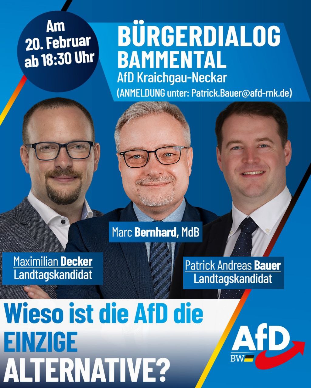 Besucht auch die Web-Seiten von unserem Landtagskandidaten Patrick Andreas Bauer https://patrickandreasbauer.de/ und der AfD Rhein-Neckar https://rnk.afd-bw.de/ . Ihr erfahrt dort alle Neuigkeiten und Termine zur Landtagswahl.