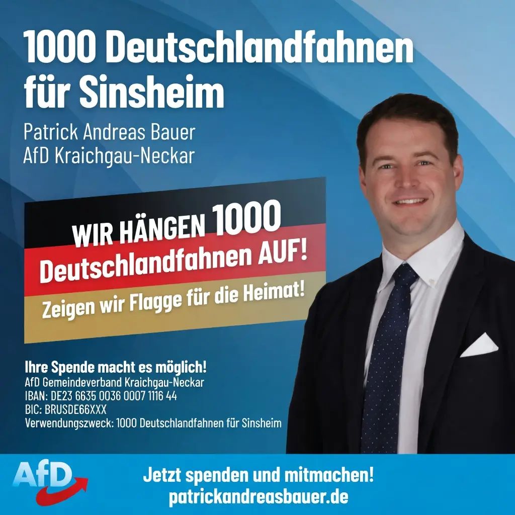 Vor dem Hintergrund der im Juni 2026 anstehenden Fußball-Weltmeisterschaft 2026 und der zahlreichen geplanten Public Viewings in der Region kündigt die AfD Kraichgau-Neckar eine große Bürgeraktion an: „1000 Deutschlandfahnen für Sinsheim". Ziel sei es, dass in Sinsheim und Umgebung wieder deutlich mehr schwarz-rot-goldene Fahnen wehen. Dies solle nicht nur die Unterstützung der eigenen Nationalmannschaft signalisieren, sondern auch die Nationalfarben normalisieren und ein Zeichen für Heimatliebe setzen. Der Vorsitzende der AfD Kraichgau-Neckar, Patrick Andreas Bauer teilt mit: